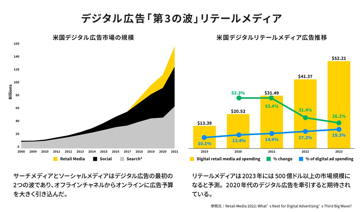 米国ではリテール領域のデータも活用した広告ビジネスがトレンドとなり、AmazonだけでなくWalmartもマネタイズに成功するなど、サーチメディア、ソーシャルメディアに続く第3の波として「リテールメディア」が急速に立ち上がっています。日本においても、コロナ禍による購買行動の変化や3rd Party Cookieの廃止など、広告やマーケティング、さらに販促のあり方が急速に変化しており、購買を起点にした「リテールメディア」の重要性が高まってきています。