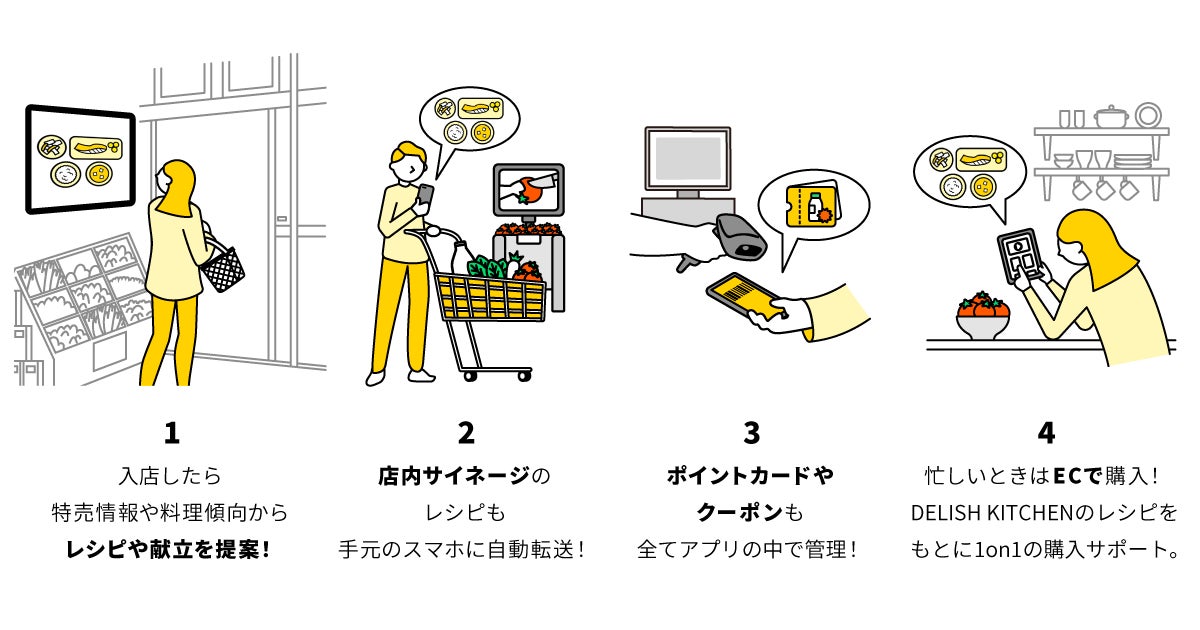 - 忙しいときはどこからでもECで商品を購入!その際も購買データや『DELISH KITCHEN』のレシピ・献立をもとに1to1の購入サポート。