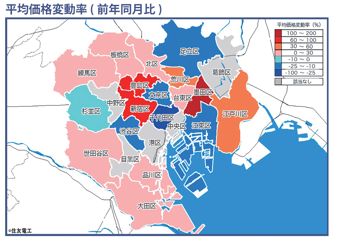地図の各行政区ごとの色の違いは、同行政区における平均価格の前年同月比(平均価格変動率)の程度を表しています。