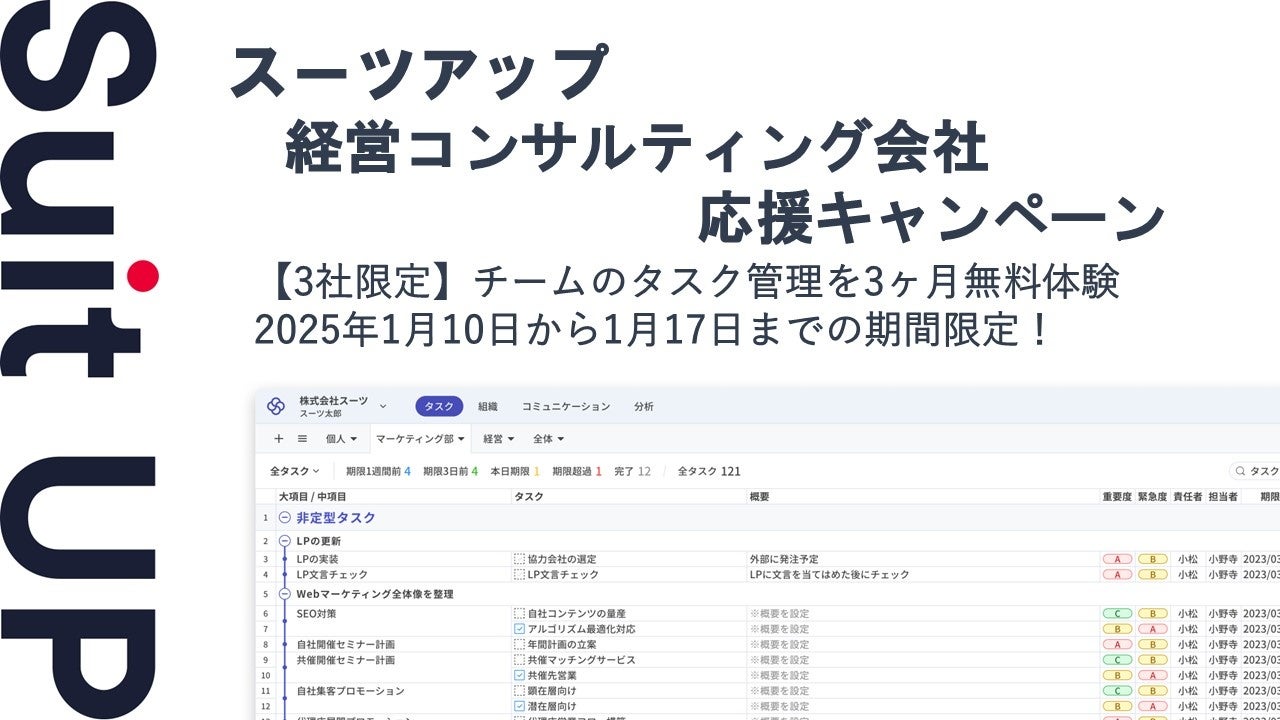 株式会社スーツ(所在地:東京都千代田区、代表取締役社長CEO:小松 裕介)は、チームでかんたん、毎日続けられるプロジェクト・タスク管理ツールの経営支援クラウド「Suit UP」(スーツアップ)において、経営コンサルティング会社応援キャンペーンを実施いたします。