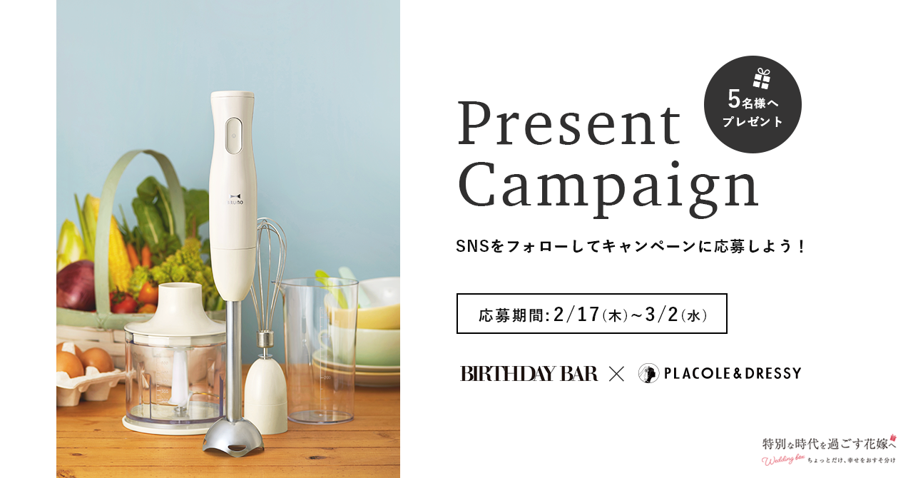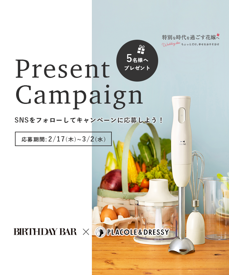 「特別な時代を過ごす花嫁へ」BIRTHDAY BAR と PLACOLE & DRESSYのコラボ企画!5名様に新生活で活躍する『BRUNO マルチスティックブレンダー』をプレゼント!