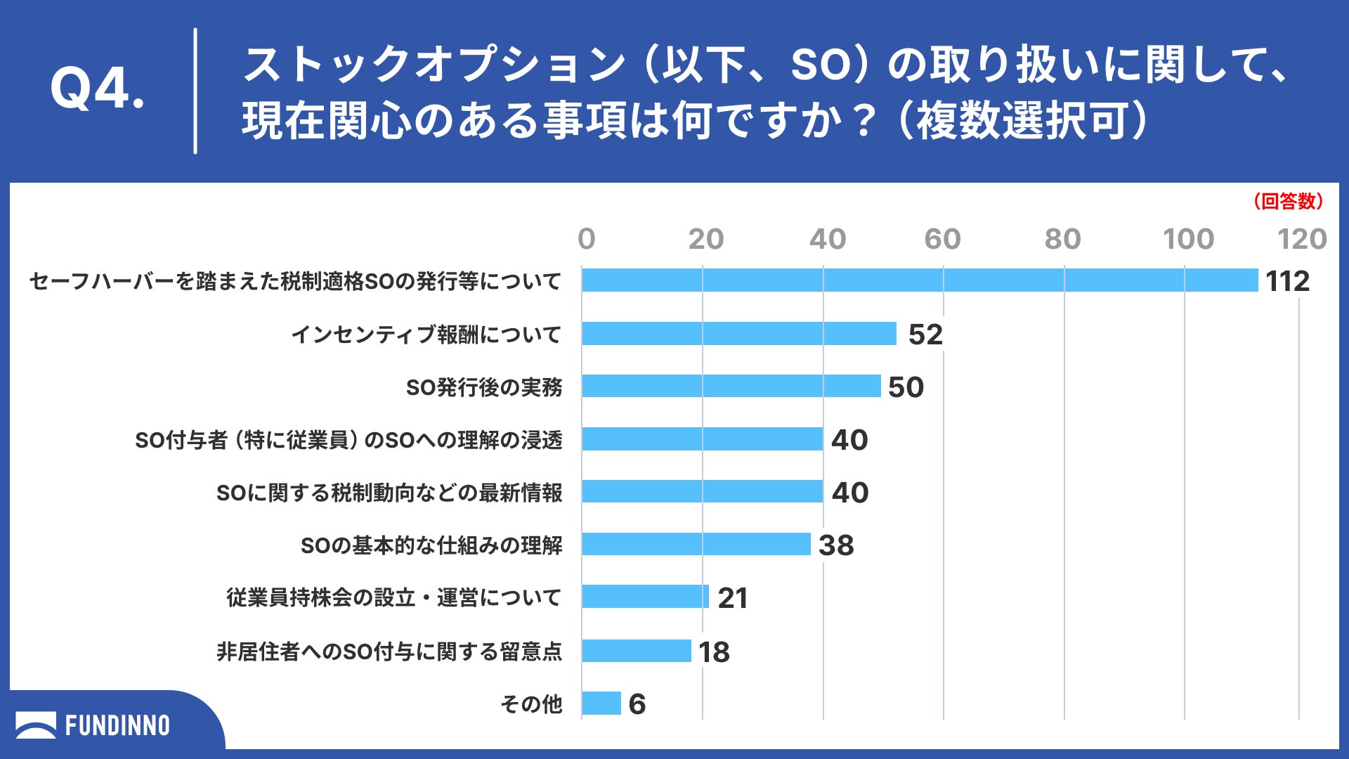 調査対象者の皆さまに「Q4.ストックオプション(以下、SO)の取り扱いに関して、現在関心のある事項は何ですか?(複数回答可)」(n=158)と質問したところ、約7割の方が「セーフハーバーを踏まえた税制適格SOの発行等について(※1)」を選択しています。