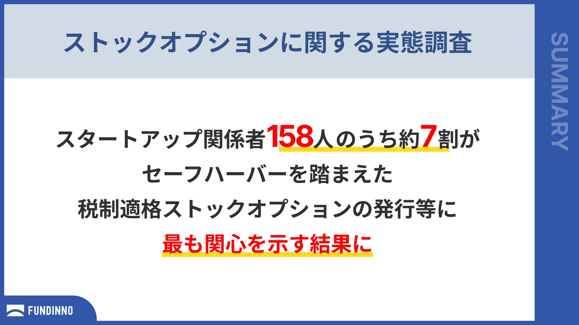 スタートアップ関係者158名に対する、ストックオプションにまつわる実態調査の結果、回答者の約7割の方々が「セーフハーバーを踏まえた税制適格ストックオプションの発行等」に最も関心を示していることが明らかになりました。