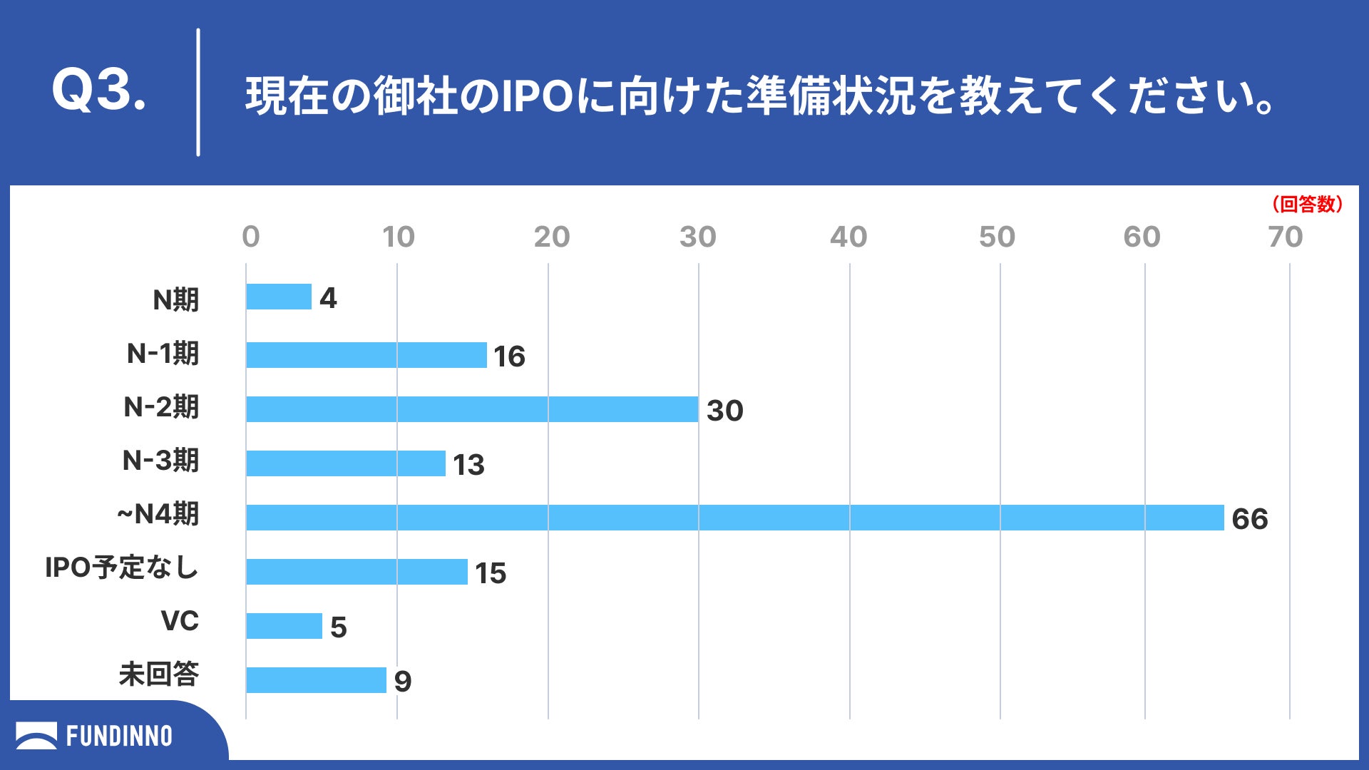 続いて、調査対象者の皆さまに「Q3.現在の御社のIPOに向けた準備状況を教えてください。」(n=158)と質問したところ、「N4期以前」が多く、続いて「N-2期」が2番目に多い回答となりました。
