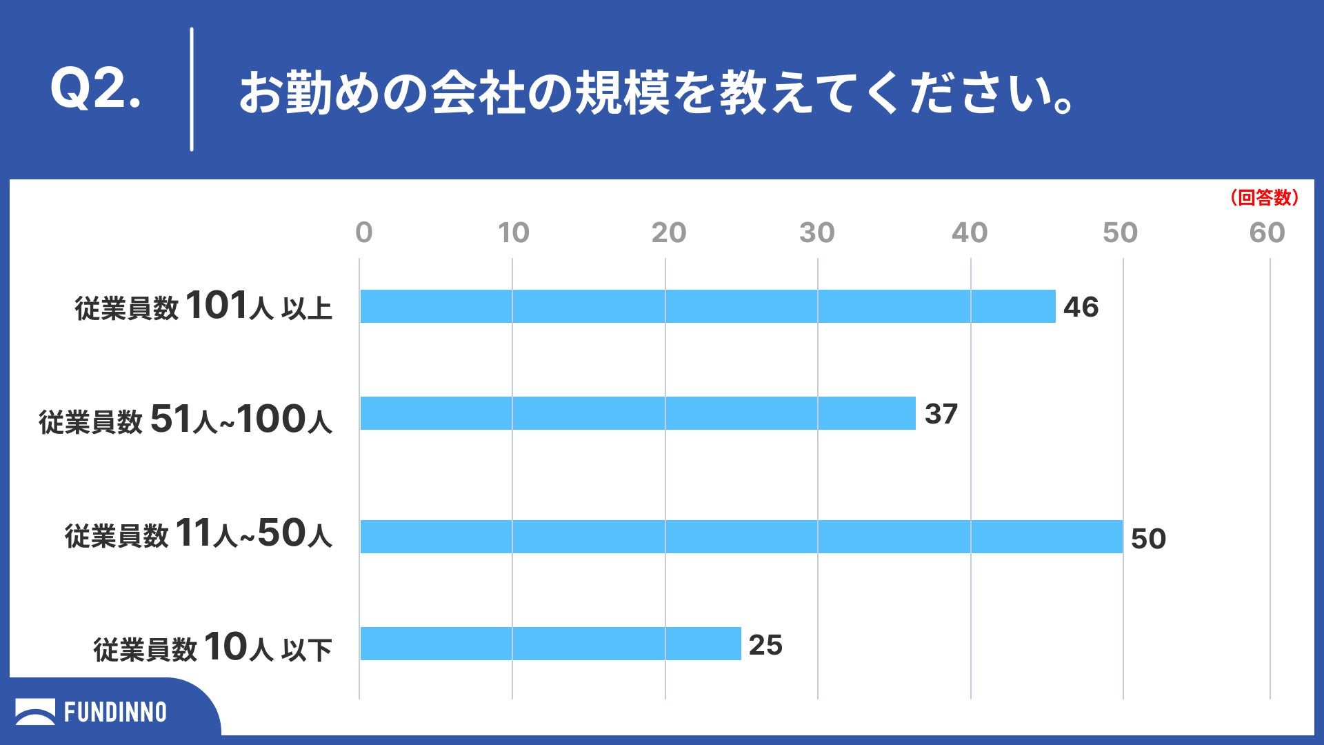 続いて、調査対象者の皆さまに「Q2.お勤めの会社の規模を教えてください。」(n=158)と質問したところ、「従業員数11人〜50人」が最も多く、「従業員数101人以上」が2番目に多い回答となりました。