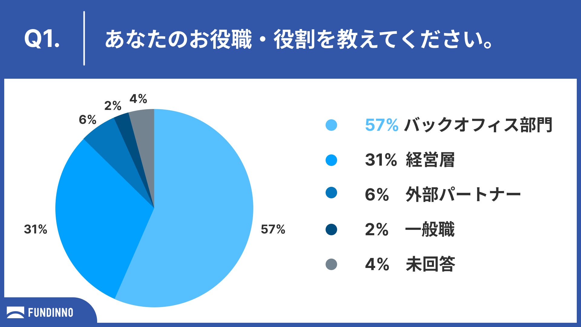 調査対象者の皆さまに「Q1.あなたのお役職・役割を教えてください。」(n=158)と質問したところ、全体の約6割が「バックオフィス部門」と回答しています。