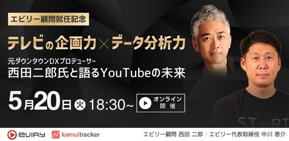 この顧問就任を記念し、エビリー代表・中川恵介と西田二郎氏によるオンライン対談トークショーを開催いたします。本イベントでは「テレビの企画力×データ分析力 元「ダウンタウンのDX」の演出・プロデューサーの西田二郎氏と語るYouTubeの未来」と題して、テレビ業界から見たYouTubeの未来や、企業がいかにしてYouTubeを活用すべきかについて、両者の視点から語ります。
