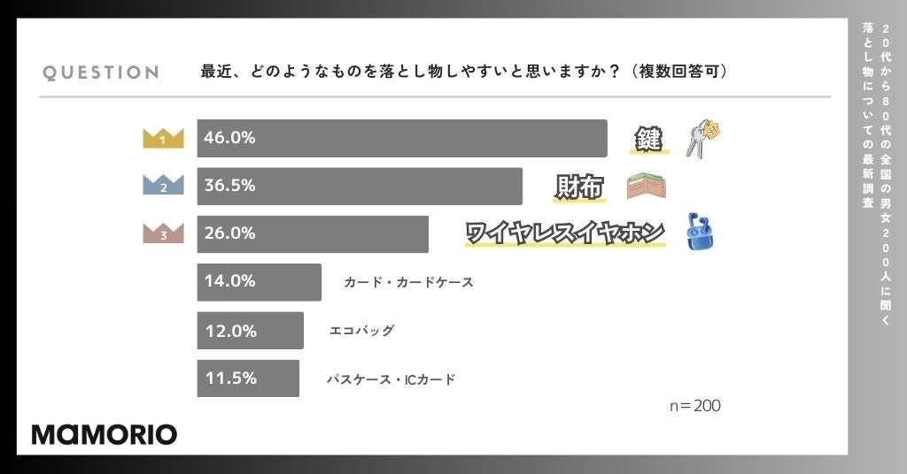 また、鍵や財布といった従来からの常連アイテムも、依然として多くの人々が紛失するリスクが高いことがわかります。