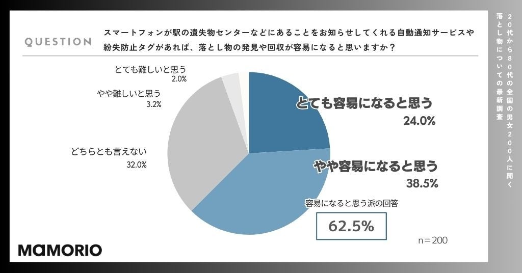 そこで「スマートフォンが駅の遺失物センターなどにあることをお知らせしてくれる自動通知サービスや紛失防止タグがあれば、落とし物の発見や回収が容易になると思いますか?」と質問したところ、「容易になる」と回答した人は62.5%(とても容易になると思うが24%、やや容易になると思うが38.5%)にのぼりました。
