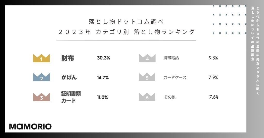 ・2023年の「落し物ドットコム」のデータによると、落とし物の中で最も多かったのは「財布」で全体の30.3%を占めた
