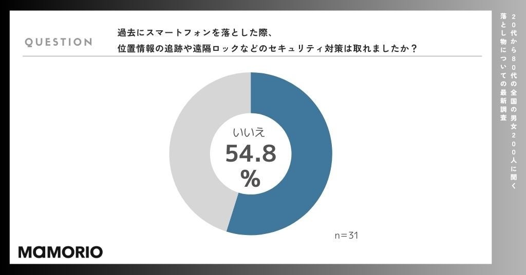 調査ではスマートフォン紛失した方を対象に「位置情報の追跡や遠隔ロックなどのセキュリティ対策は取れましたか?」という質問をし、その結果「いいえ」が54.8%となりました。