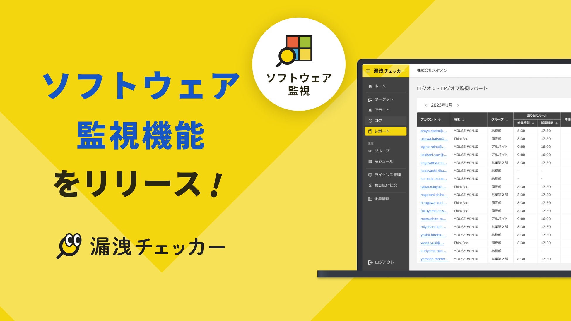 株式会社スタメン(東京本社:東京都千代田区、代表取締役CEO:大西泰平)は、クラウド型IT資産管理・操作ログ管理ツール「漏洩チェッカー」に新機能「ソフトウェア監視」をリリースしたことをお知らせいたします。