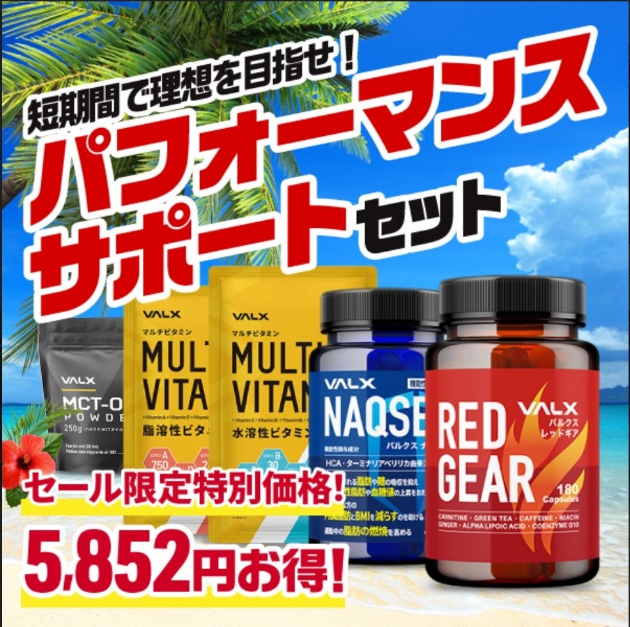 セット内容:レッドギア、ナクセル、マルチビタミン水溶性、マルチビタミン脂溶性、MCTオイルパウダー