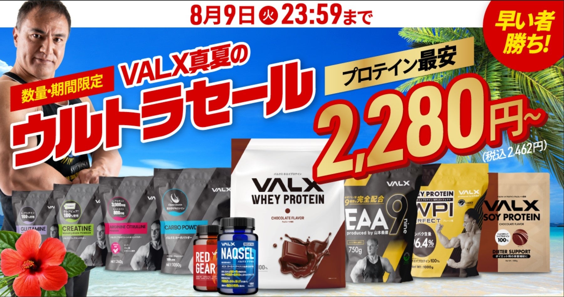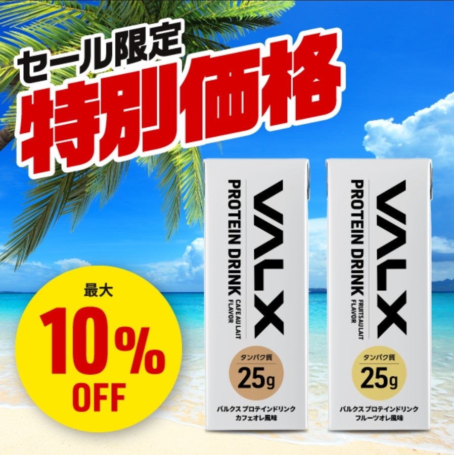 フィットネスブランド「VALX(バルクス)」を展開する株式会社レバレッジ(本社:東京都渋谷区 代表取締役:只石昌幸、以下レバレッジ)は、山本義徳氏プロデュースの「VALX」において2022年7月20日(水)から8月9日(火)まで、真夏のウルトラセールを開催いたします。人気ナンバー1のVALXホエイプロテインをはじめ、最大1万円以上お得になる限定セットなど目玉商品を多数ご用意しておりますので、この機会にぜひご利用ください。