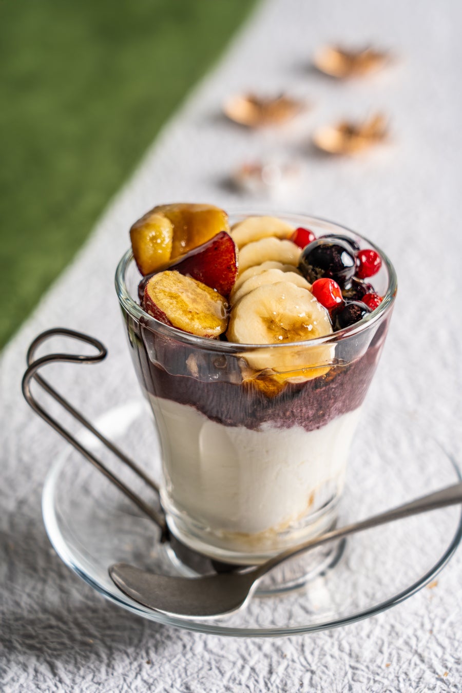ヨーグルトとグラノーラに栄養価の高いアサイーをたっぷりと注ぎ、ほっこり優しい甘さのさつまいもやバナナ、ベリーをのせ、たっぷりとはちみつをかけて食べる、冬に嬉しいヘルシースイーツです。これからの季節にぴったりな1品を、おやつや朝食としてぜひお楽しみください。
