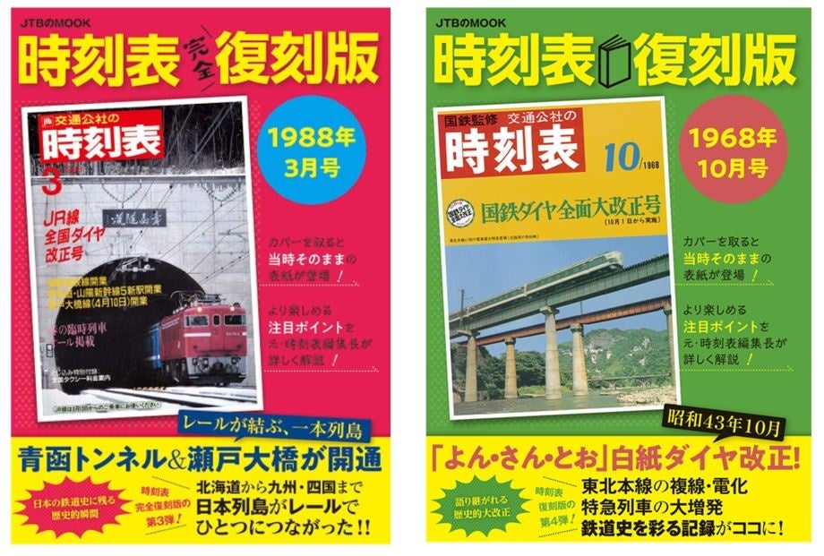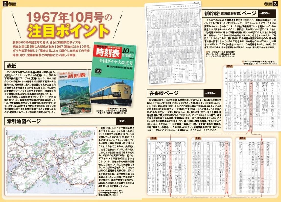 表紙にはカバーを付け、資料としても保存しやすい仕様となっています。カバーをとった表紙には当時そのままのデザインを再現。世界初のオール寝台電車の特急「月光」と昼行特急「みどり」に使用される電車を表紙に採用しています。また、本書の中で、注目するべき誌面のポイントを、元『JTB時刻表』編集長で、現在は鉄道ライター等としても活躍する木村嘉男氏が解説。より興味深く楽しめる一冊となっております。