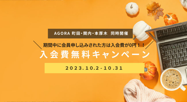 AGORAは〝夢が加速する〟というコンセプトのもと運営する、事業相談もできるコワーキング&シェアオフィスです。カフェのようなリラックスした雰囲気とオフィスの快適な設備を兼ね備え、駅から徒歩3分圏内、事業アドバイスやビジネスイベントなどを通じてさまざまなニーズにお応えしています。今回、AGORA3拠点合同の「入会費無料キャンペーン」を2023年10月2日(月)〜10月31日(火)までの期間限定で実施いたします。
