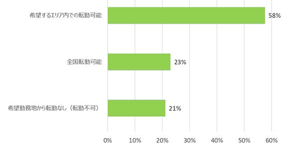 勤務地・転勤についての質問では、「希望するエリア内での転勤可能」という回答が最も多く、58%となった。また、「全国転勤可能」と回答した割合は23%となった。
