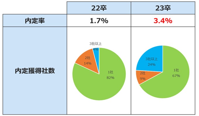 23卒の内定率は3.4%、22卒と比べ2倍となっている。また、内定獲得社数は22卒と比べ「1社」の割合が減り、「3社以上」の割合が増え内定獲得社数の平均が増えたことが分かった。