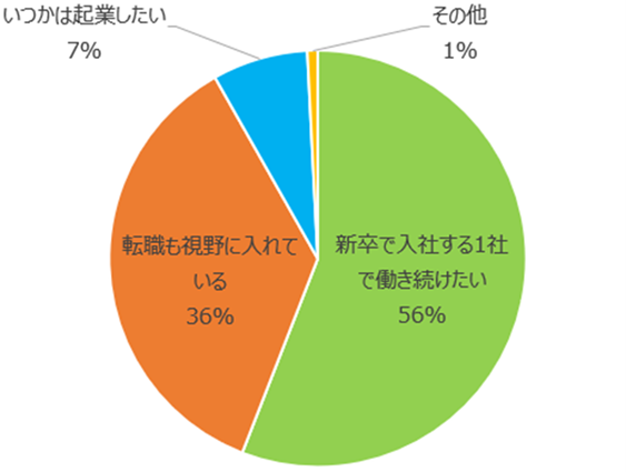 新卒で入社した企業でのキャリア形成についての質問では、「新卒で入社する1社で働き続けたい」と回答した学生が最も多く、56%となった。