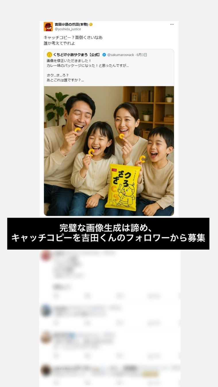 X(旧Twitter)のサクまろアカウント( @sakumarosnack )と26万フォロワーを擁する鷹の爪団・吉田くんのアカウント( @yoshida_justice )からフォロワーに呼びかけ、サクまろを楽しむシチュエーションやキャッチコピーなどのアイデアを募集。そのアイデアを活かした画像や動画を即座に生成・投稿します。