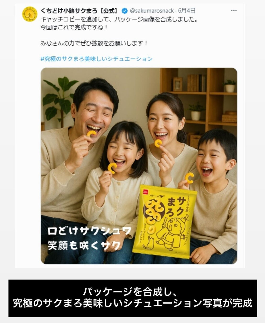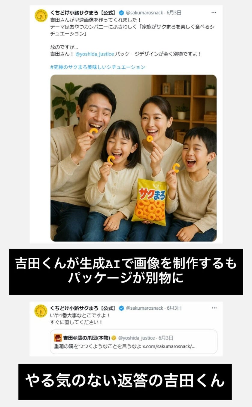 ふんわりサクサクッとした軽い食感が特徴のスナック菓子『サクまろ』のコンビニエンスストアやスーパーマーケットでの販売強化に伴い、SNS上のコミュニケーションを起点とし、生成AIを駆使してスピード感のあるコンテンツ制作を行う「#究極のサクまろ美味しいシチュエーション」プロジェクトが6月2日からスタートしました。