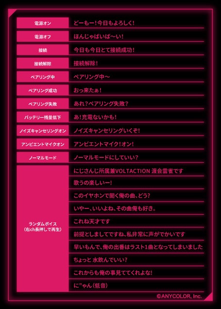 イヤホンの起動/終了や端末との接続状況をお知らせする「ボイスガイダンス」と、いつでも好きなタイミングで聴ける「ランダムボイス」を完全新規録りおろしで収録。