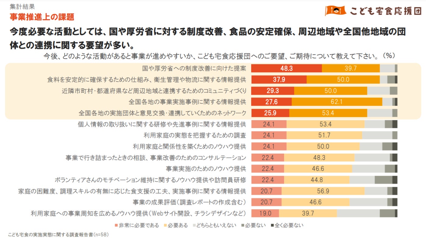 2021年3月にこども宅食実施団体向けに行った実態調査では、「事業を安定的に実施するための財源がないこと」に課題を感じると回答した団体が70.7%にのぼり、87.9%が「食料を安定的に確保するための仕組み、衛生管理や物流に関する情報提供」を必要としていることが分かっています。
