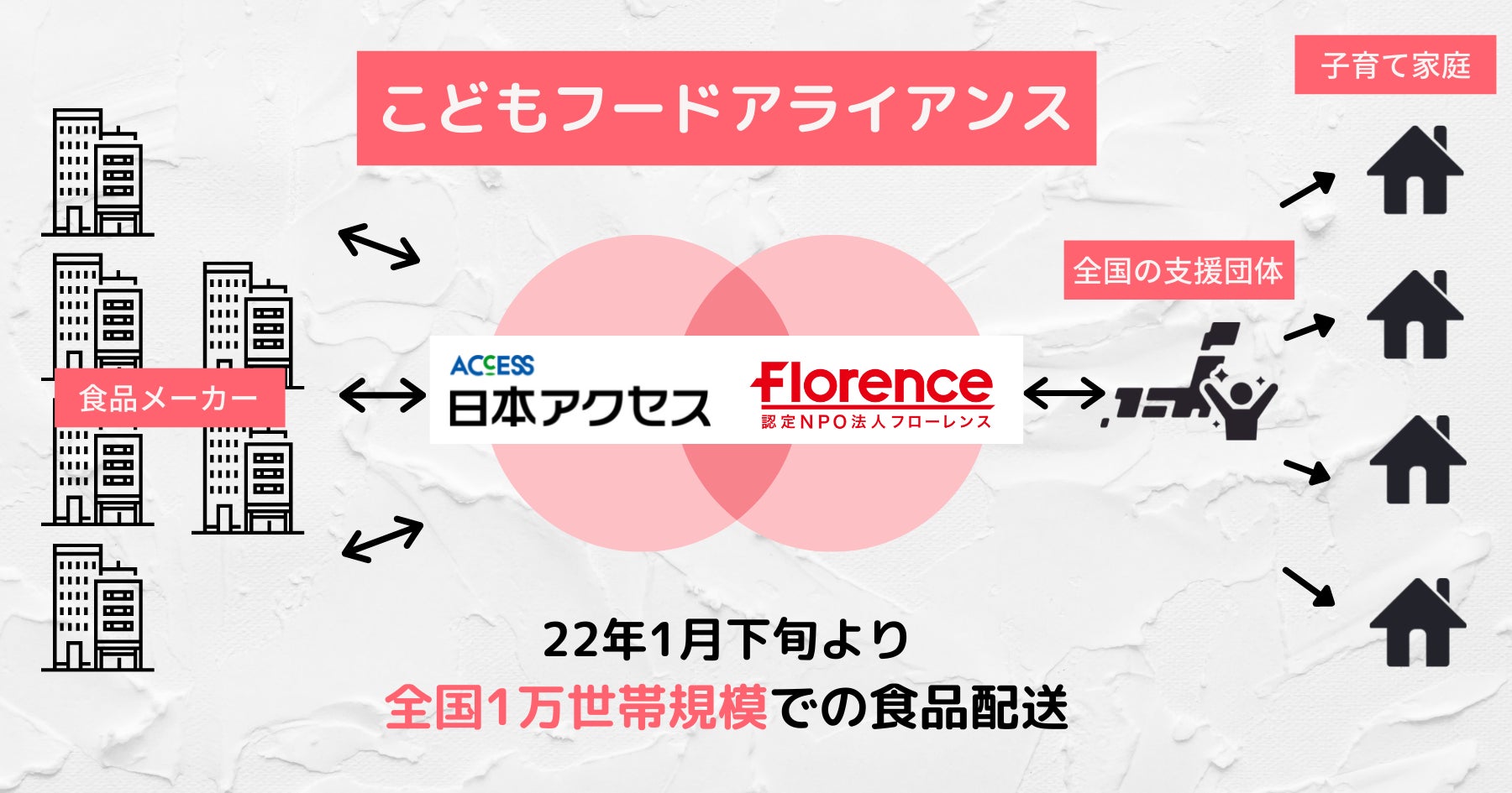 第一弾となる本年1月の取組においては、日本アクセスが各食品メーカーに協賛を募り、趣旨に賛同したメーカー各社より提供いただく食品をフローレンスが東京で一括集約、こども宅食応援団の連携先団体へ配送いたします。配送にかかる費用は日本アクセスがサポートします。
