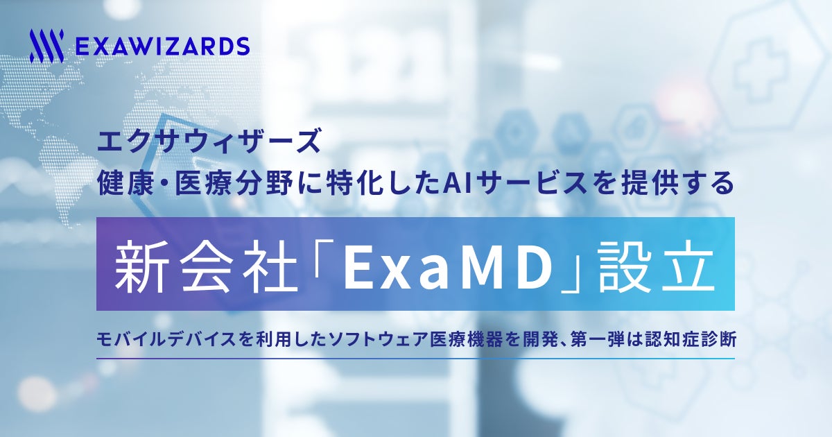 ExaMDは現在エクサウィザーズで開発中の、会話音声や動作を基にして、認知症を簡易かつ短時間に診断できる認知症診断のプログラム医療機器(SaMD)の事業を継承します。また新会社の医療機器製造販売業の業許可取得も視野に、医療機器として早期の承認に向け取り組んでいるところです。今後、具体的な動きがあり次第、お知らせしていく予定です。