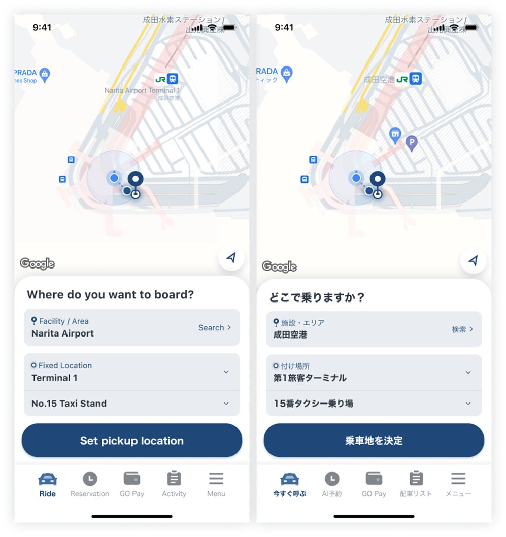 この度、日本の出入国者数第1位※3の成田空港における実証実験開始によって、『GO』での注文時、成田空港を指定すると、第1ターミナル15番タクシー乗り場、第2ターミナル31-Aタクシー乗り場でのご乗車が選べ、スムーズなお待ち合わせが可能となります。訪日外客にとっても目的地を事前にアプリに入力して手配することで乗務員と最小限のやり取りで移動ができるとともに、降車・決済までをアプリ内で完結することができます。