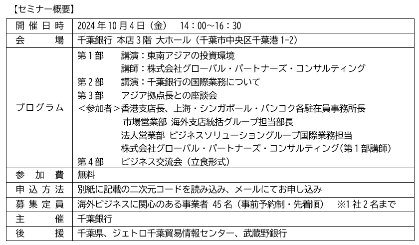 千葉銀行(頭取 米本 努)は、2024年10月4日(金)、海外ビジネスに関心のある事業者さまを対象とした「東南アジア展開セミナー」を開催します。