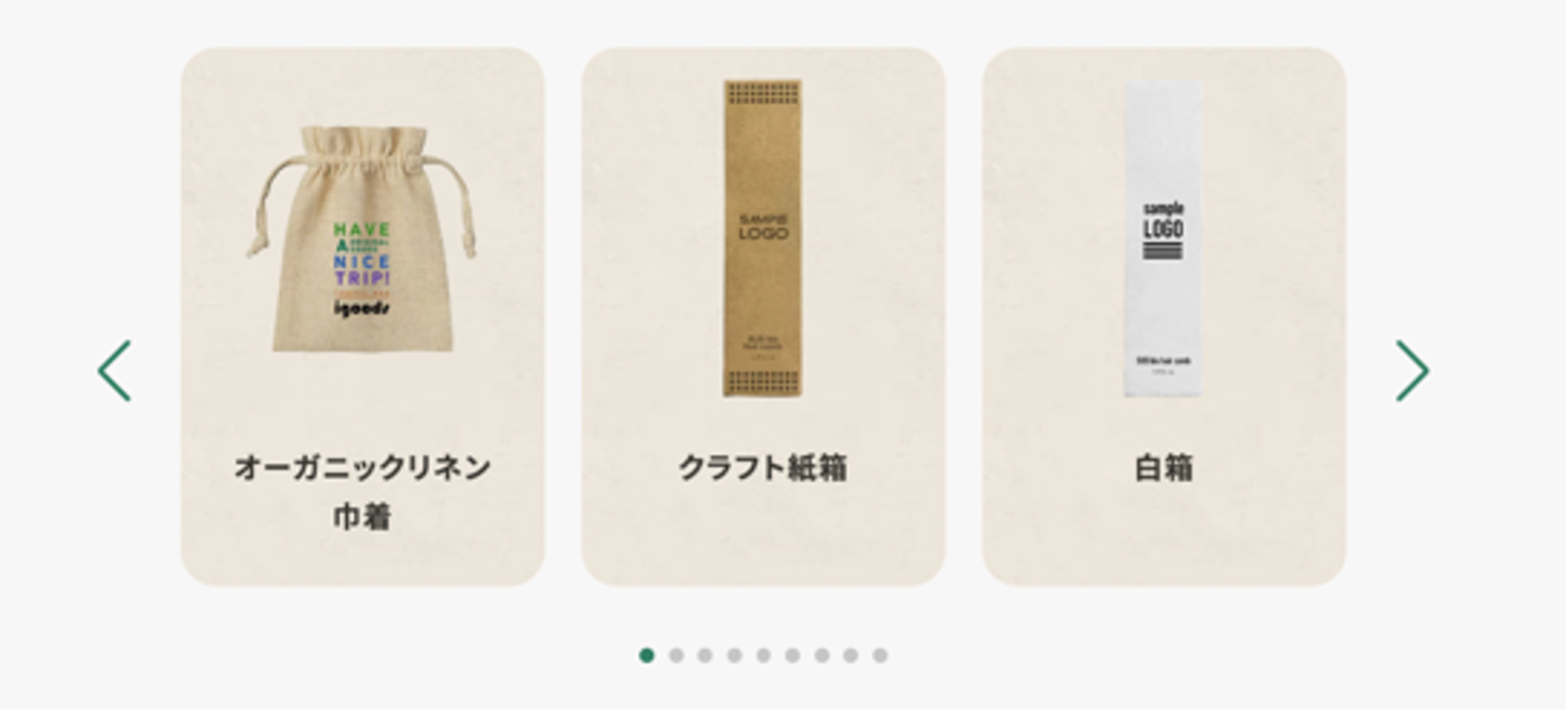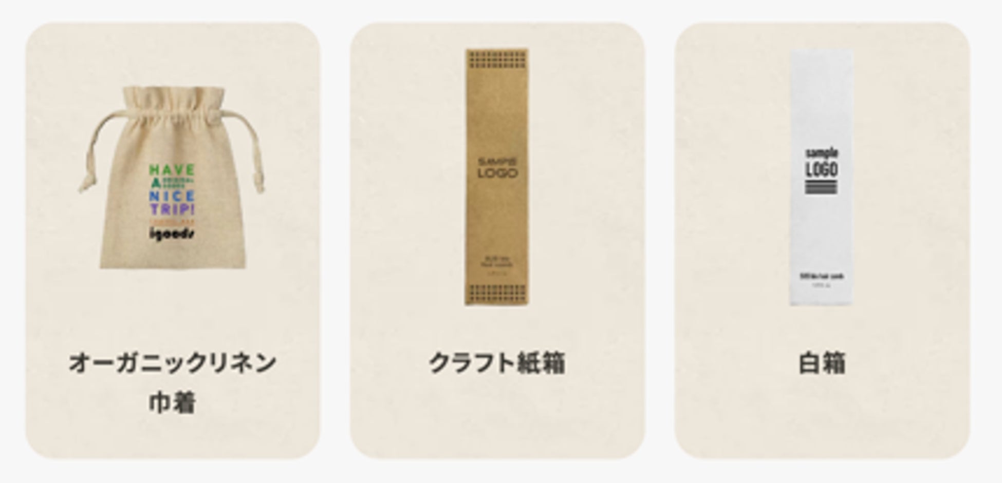 パッケージは、単品用とセット用をご用意しています。単品用パッケージでは箱や袋など5種類以上あり、クラフトや白紙、PLA等の素材を展開中です。また、複数アメニティを入れられるセット用巾着も展開。再生コットン、オーガニックコットン、麻などエコ素材の選択に加え、メッシュやリボン付きなど、形状も完全オリジナルで制作が可能です。