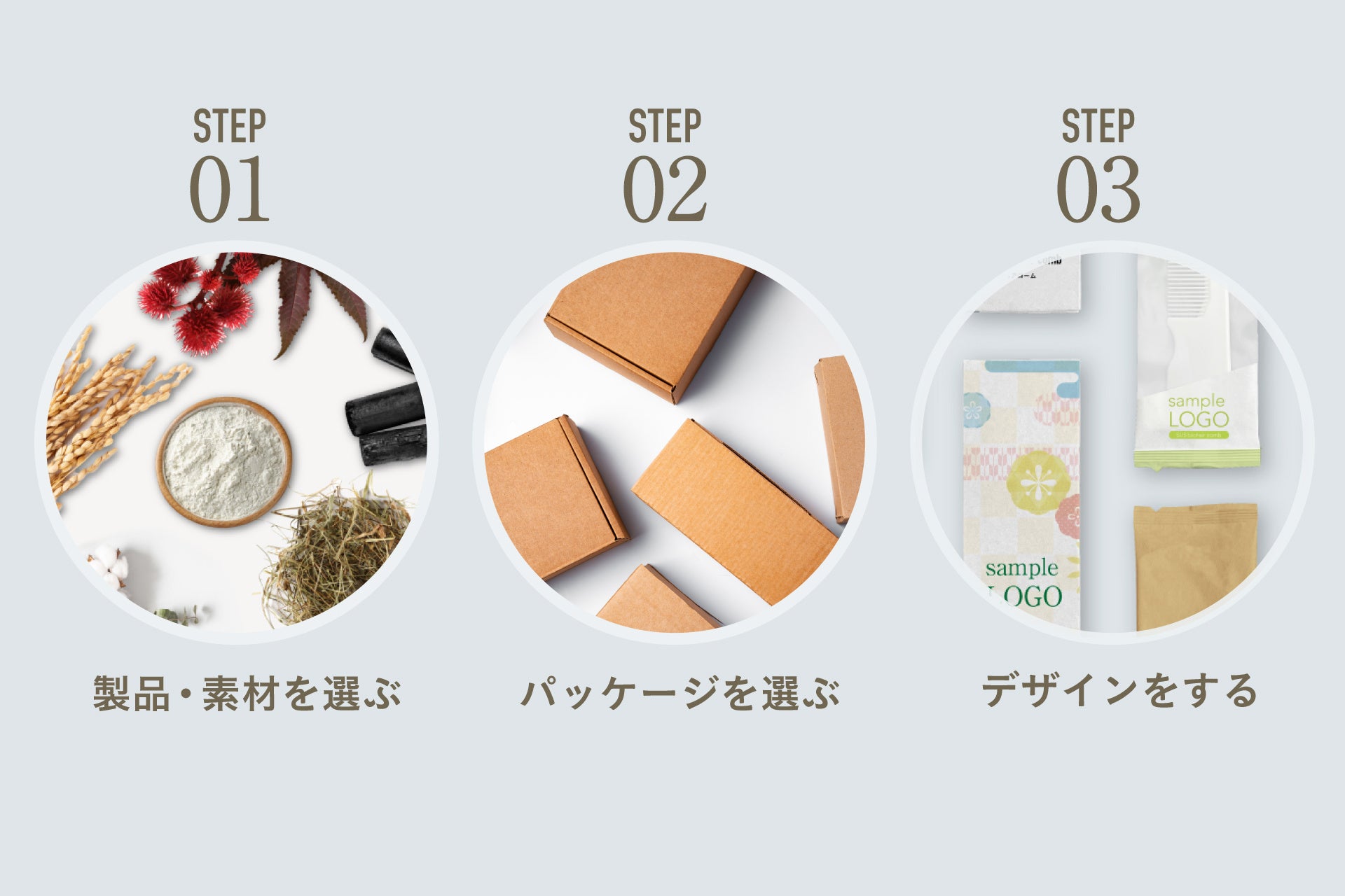 オリジナルエコアメニティは、以下3つの簡単なステップで制作が可能です。