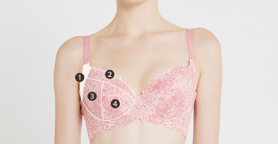 4枚の布パーツをつなぎ合わせた、ヘブンジャパン独自の4枚接ぎの立体設計でバストを中央に寄せてスッキリ見せ。2~3枚接ぎの一般的なブラジャーでは作れない、ナチュラルな立体感を生み出します。
