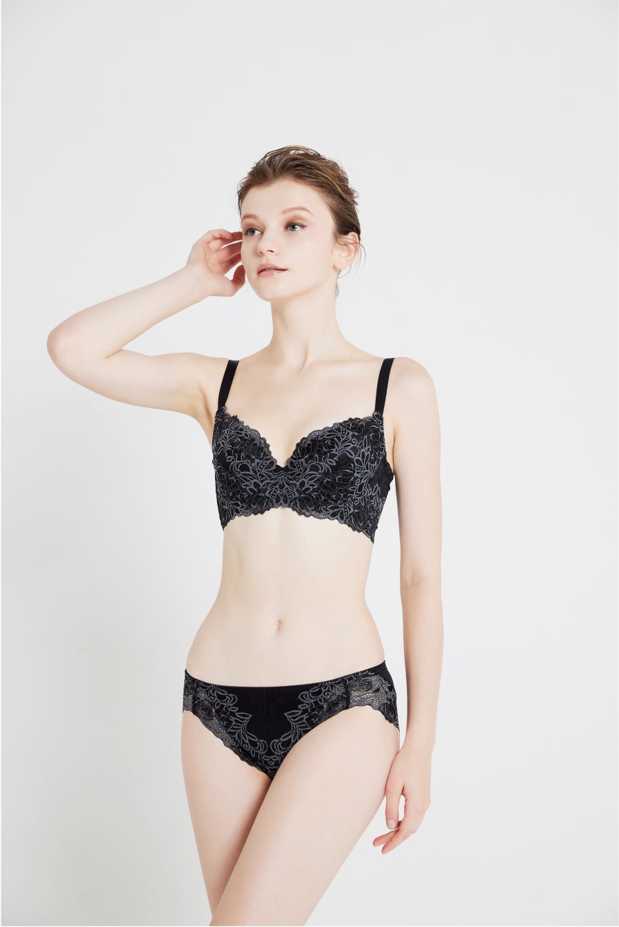 大人っぽいブラックにグレーのレース柄で華やかさをプラス。定番のカラーで単調になりがちなブラックも、クラシカルなレースデザインで大人っぽいおしゃれな雰囲気に。ブラックのブラジャーは薄着になる夏服で、ブラ紐が見えても気にならないので夏でも大人気です。