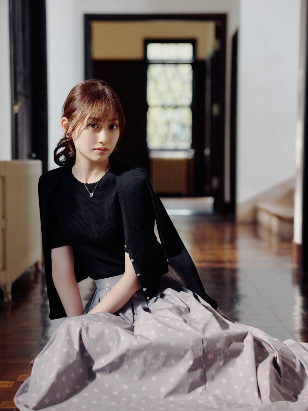 今回のコラボレーションは、星風まどかさんの可憐さと上品な魅力を表現した特別な3アイテムをラインアップ。リボン柄ワンピースは、すっきりとした上身頃とふんわり広がるスカートで、美しいシルエットを演出。花柄ポップコーン編みのカーディガンとニットは、ビジューボタンやフリル袖が華やかなアクセントに。日常のお出かけから特別なシーンまで、纏うたびに心ときめく装いを提案します。