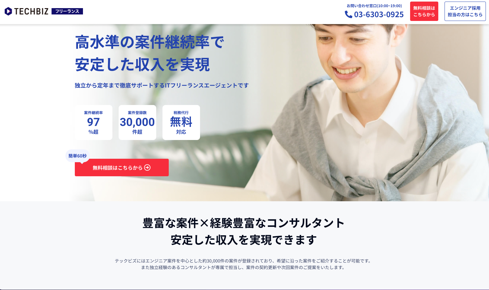 「テックビズフリーランス」は日本最大級のITフリーランス案件プラットフォームです。