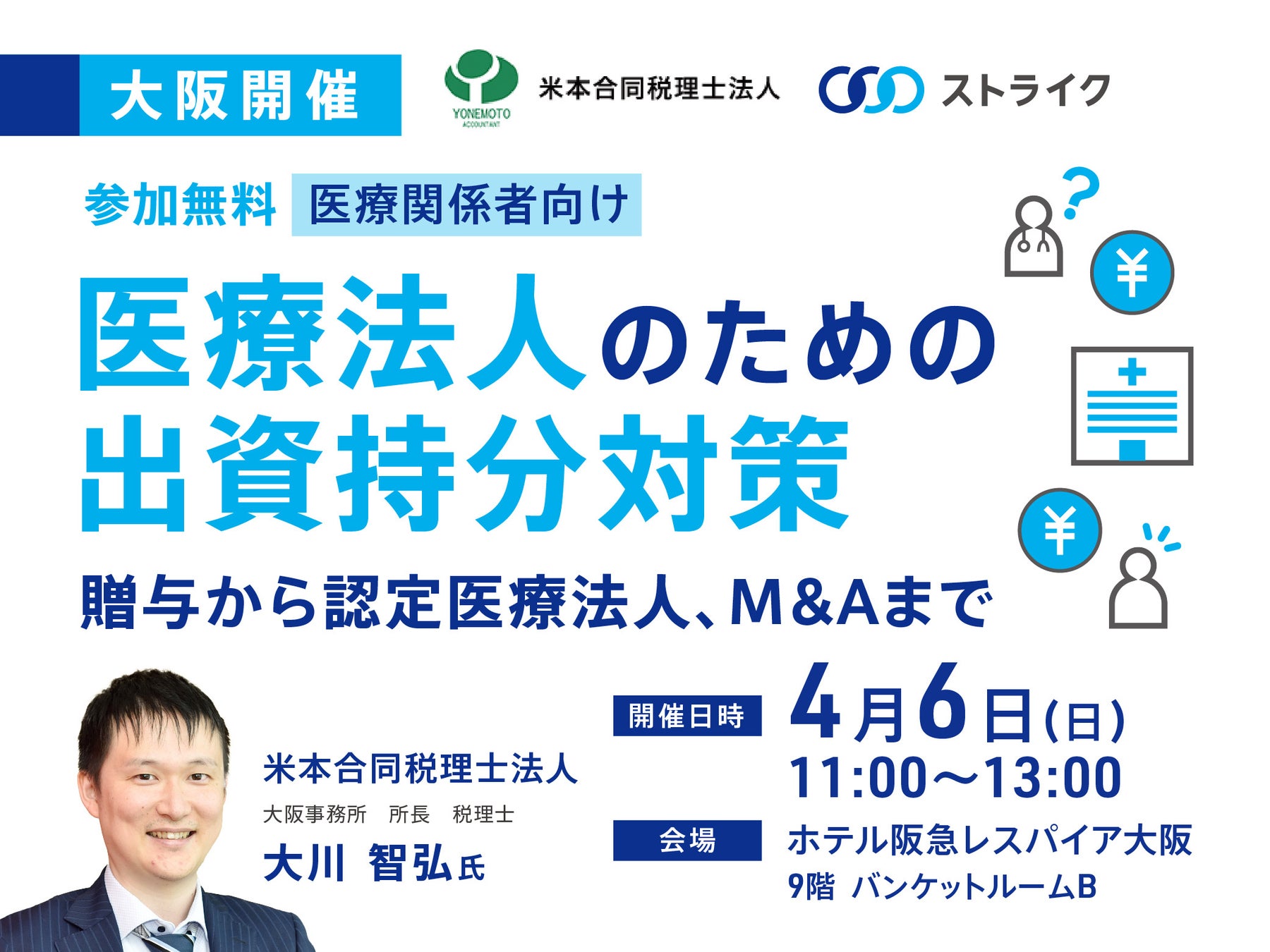 株式会社ストライク(東京都千代田区、代表取締役社長:荒井邦彦)は2025年4月6日(日)に大阪で医療関係者向けの無料セミナー『医療法人のための出資持分対策 贈与から認定医療法人、M&Aまで』を米本合同税理士法人と共同開催します。