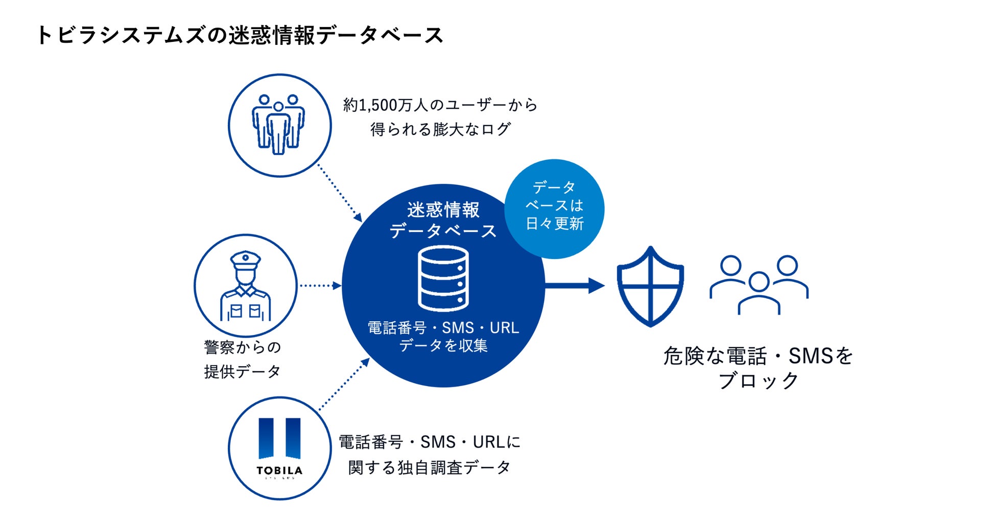 トビラシステムズの迷惑情報データベースは、警察、外部機関、利用者から提供された情報に加え、トビラシステムズの独自調査情報を統合データベース化し、迷惑電話の検知に利用しています。