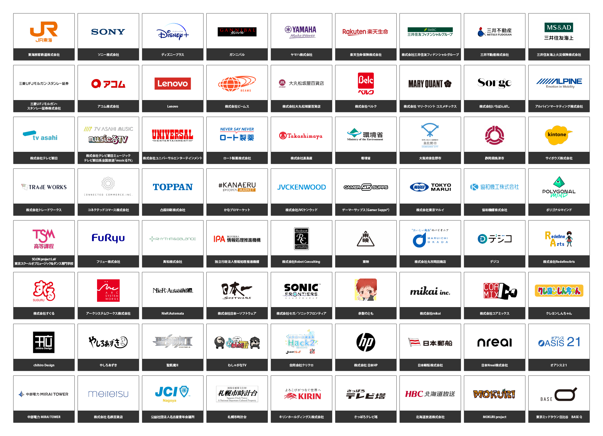 三菱UFJモルガン・スタンレー証券株式会社/アコム株式会社/Lenovo/株式会社ビームス/株式会社大丸松坂屋百貨店/株式会社ベルク/株式会社 マリークヮント コスメチックス/株式会社いちばんぼし/アルパインマーケティング株式会社/株式会社テレビ朝日/株式会社テレビ朝日ミュージック/テレビ朝日系全国放送「musicるTV」/株式会社岩本町芸能社/株式会社ユニバーサルエンターテインメント/ロート製薬株式会社/株式会社髙島屋/環境省/大阪府泉佐野市/静岡県焼津市/サイボウズ株式会社/株式会社トレードワークス/コネクテッドコマース株式会社/凸版印刷株式会社/かなプロマーケット/株式会社JVCケンウッド/ゲーマーサップス(Gamer Supps®)/株式会社東京マルイ/協和機工株式会社/ポリゴナルマインド/SO.ON project LaV 東京スクールオブミュージック&ダンス専門学校/フリュー株式会社/興和株式会社/独立行政法人情報処理推進機構/株式会社Robot Consulting/東映株式会社/株式会社丸市岡田商店/デジコ/RedefineArts/株式会社すぐる/ アークシステムワークス株式会社/NieR:Automata/株式会社日本一ソフトウェア/株式会社セガ/ソニックフロンティア/赤髮のとも/株式会社mikai/株式会社コアミックス/クレヨンしんちゃん/chihiro Design/やしろあずき/聖飢魔Ⅱ/わしゃがなTV/合同会社クリクロ/株式会社 日本HP/日本郵船株式会社/日本Nreal株式会社/オアシス21/中部電力 MIRAI TOWER/株式会社 名鉄百貨店/公益社団法人名古屋青年会議所/札幌市時計台/キリンホールディングス株式会社/さっぽろテレビ塔/さっぽろ雪まつり実行委員会/北海道放送株式会社/MOKURI project/東京ミッドタウン日比谷 BASE Q