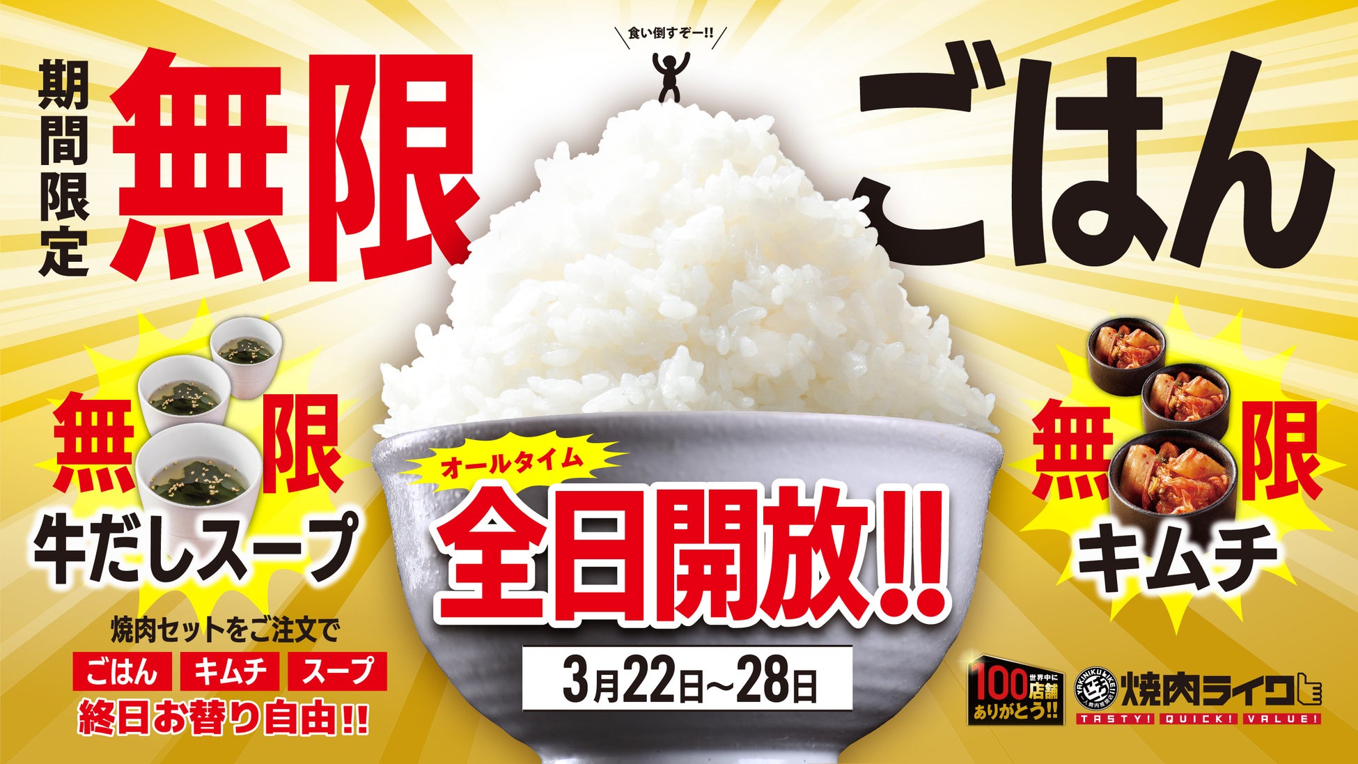 株式会社焼肉ライク(所在地:東京都渋谷区、代表者 有村 壮央)が運営する焼肉のファストフードをコンセプトにした「焼肉ライク」はまん延防止措置解除の3月22日(火)から3月28日(月)の期間、対象店舗にて「焼肉セット」をご注文のお客様に“ごはん・キムチ・スープ”が無限におかわりができるキャンペーンを実施します。まん延防止等重点措置期間で、なかなか外食できなかった皆様に、焼肉を存分に楽しんでいただきたいという企画となります。焼肉ライクでは、安心してお客様にお食事を楽しんでいただけるよう、引き続き、衛生管理を徹底して営業してまいります。