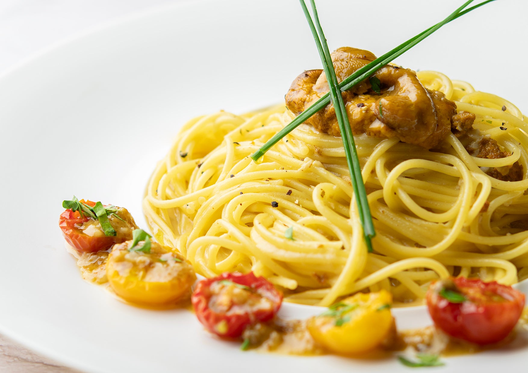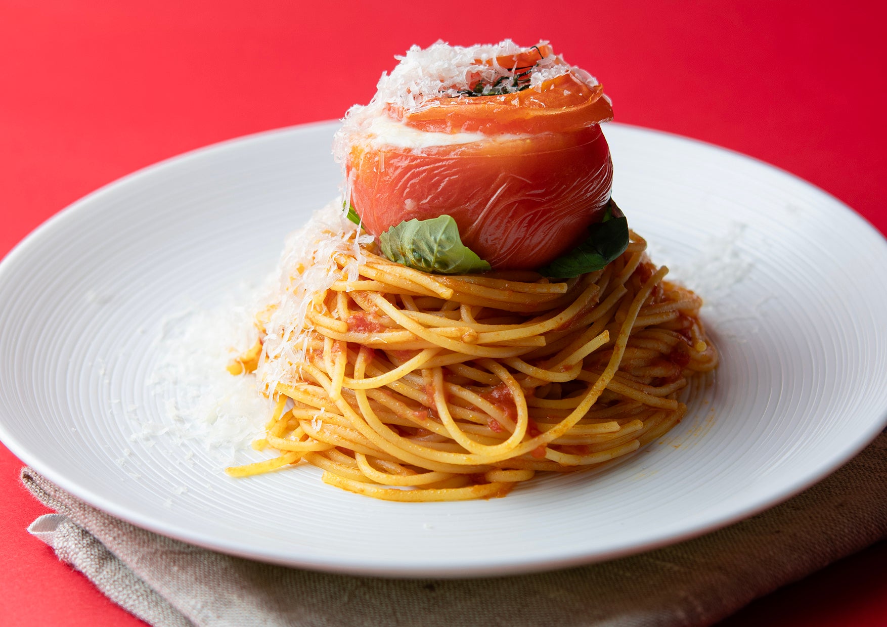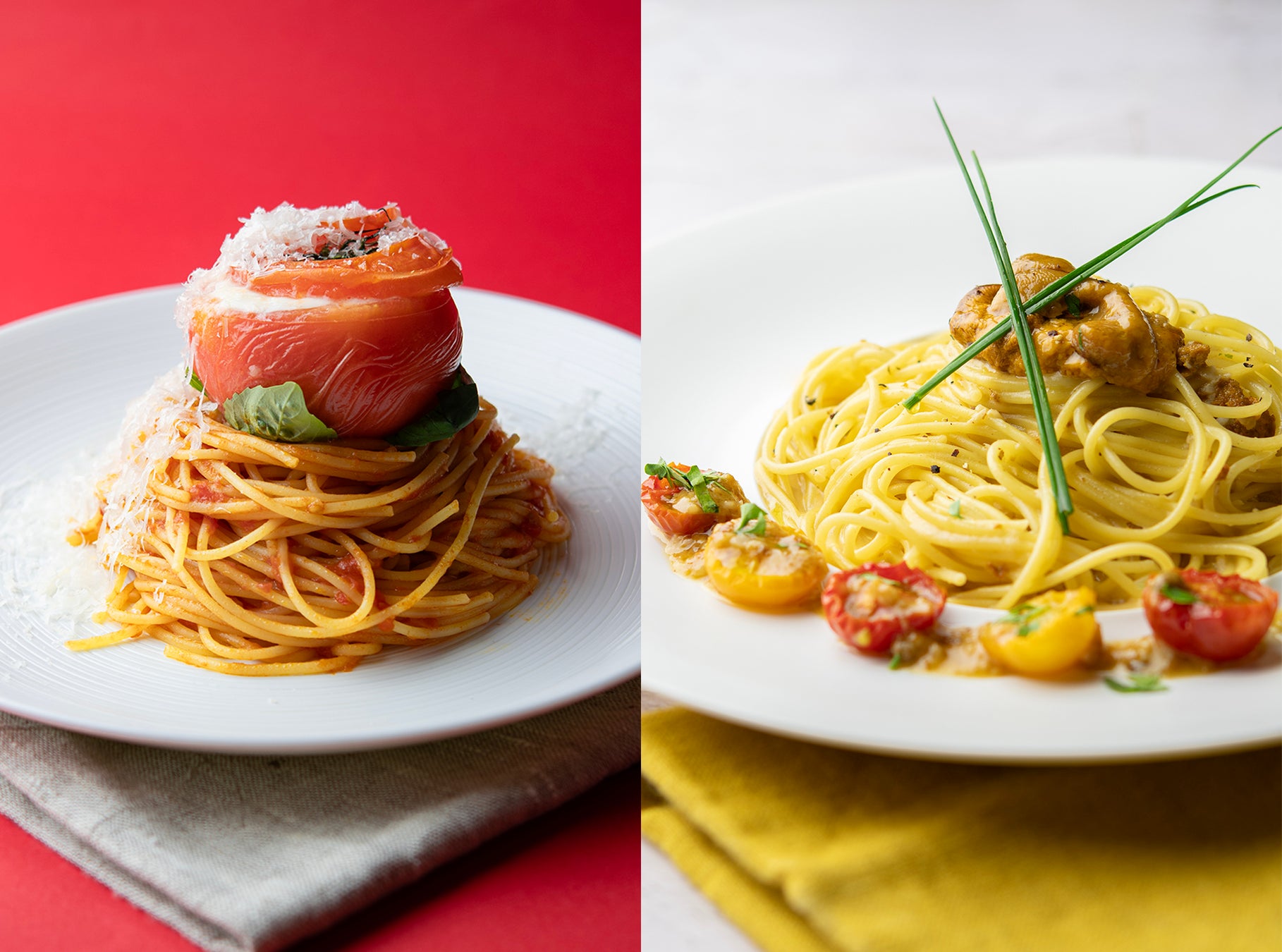先行してスタートするスパゲッティ2品は、まるごとトマトを割るとチーズソースが溢れ出す『モッツァレラ・エ・ポモドーロ』とカラフルなソースが目を引く『スパゲッティ 生うにの軽いクリーム仕立て セミドライトマトと雲丹香る焦がしバターを添えて』の2品。思わずスマホを向けたくなるビジュアルはもちろん、1度食べたらきっとまた食べたくなるとっておきのメニューが誕生しました。