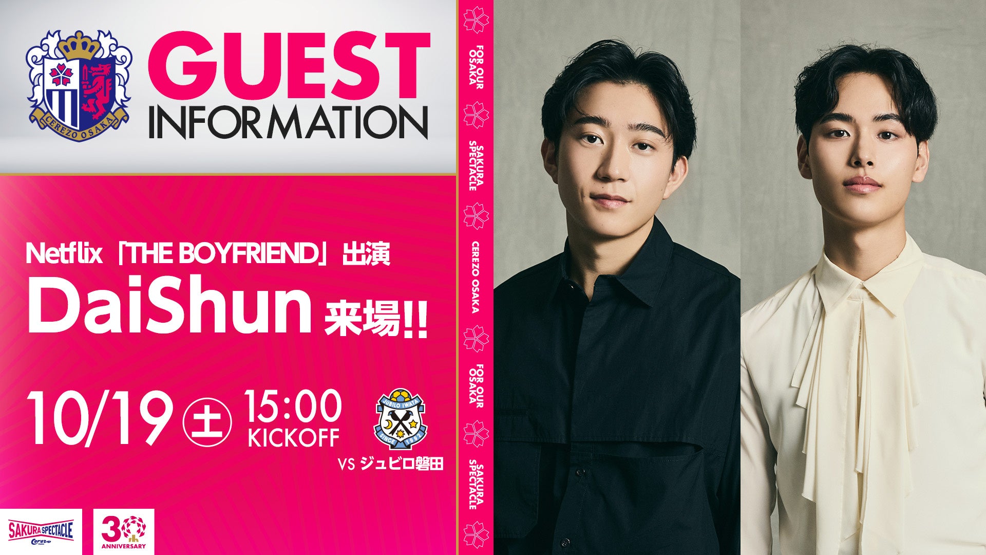 【セレッソ大阪】10/19(土)磐田戦 セレ女デーをさらに盛り上げる!Netflix「THE BOYFREIND」に出演のDaiShun来場!