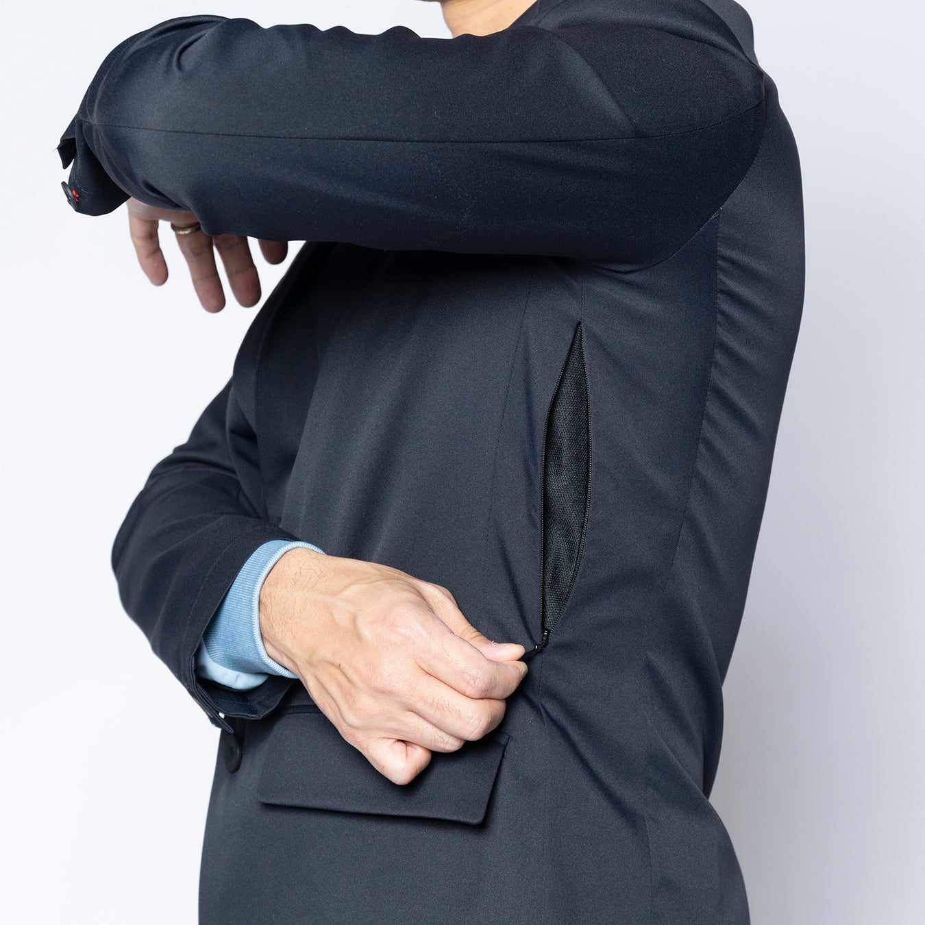 ジャケット脇下とパンツサイドに、蒸れを防止し、温度調節も可能にするベンチレーションを搭載。パンツのベンチレーションはゴルフケース兼用でゴルフボールも収納可能。