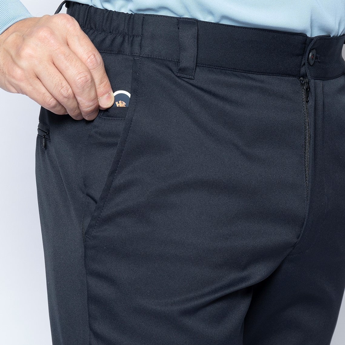 パンツサイドにゴルフ時のスイングをサポートする伸縮ウエストゴムを設計。ウエスト内側にも滑り止めを、スイングの際にインしたシャツがでてしまうことを防止。