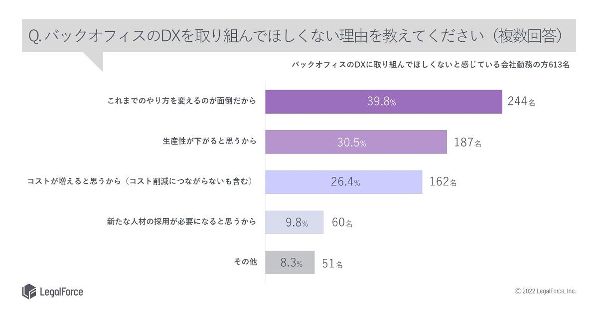 ・会社にバックオフィスのDXを「取り組んでほしくない理由」は、「これまでのやり方を変えるのが面倒だから」が39.8%で最多