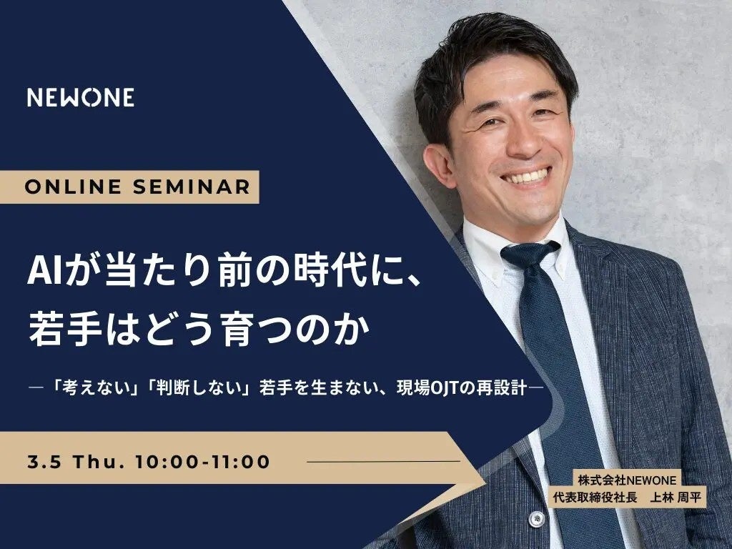 エンゲージメント向上を軸とした組織開発・人材育成コンサルティング支援を通して“推せる職場づくり”を進める株式会社NEWONE(本社:東京都港区 代表取締役:上林周平、https://new-one.co.jp/ 以下、NEWONE)は、2026年3月5日(木)10:00~11:00にて、「AIが当たり前の時代に、若手はどう育つのか」について、オンラインセミナーを実施いたします。