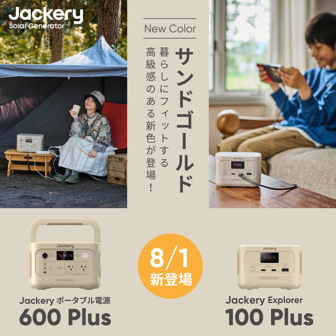 ポータブル電源・ソーラーパネルの世界的リーディングカンパニー・Jackery(ジャクリ)の日本法人である株式会社Jackery Japan(本社:東京都中央区)は、2024年4月に発売した軽量コンパクトな中容量モデルの「Jackery ポータブル電源 600 Plus」と、2023年12月に発売した機内持ち込みも可能な手のひらサイズのミニモデル「Jackery Explorer 100 Plus」から、新色「サンドゴールド」を各EC店舗や家電量販店にて8月1日(木)より販売開始いたします。