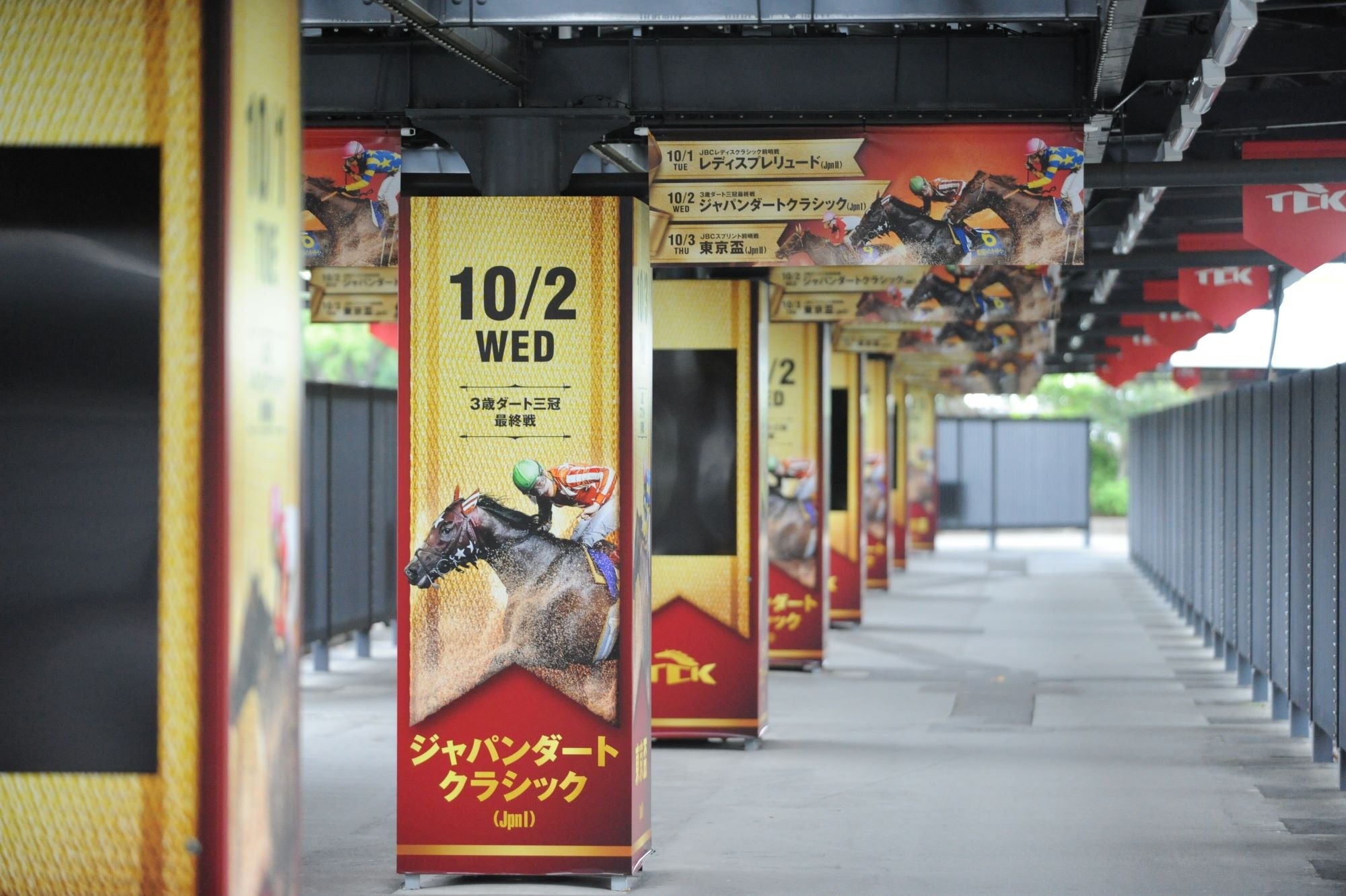 ジャパンダートクラシック(JpnⅠ)が行われる大井競馬第10回開催(9/29~10/4)は、大井競馬場内を特別仕様の装飾一色で彩ります。北門入口からL-WINGへ続くアーケードには、昨年のレディスプレリュード・ジャパンダートダービー・東京盃の勝馬が登場し、レースの高揚感を醸成いたします。また、ゴール板もJDCにあわせた特別仕様となりますので、レースをご覧の際はゴール板にもご注目ください。